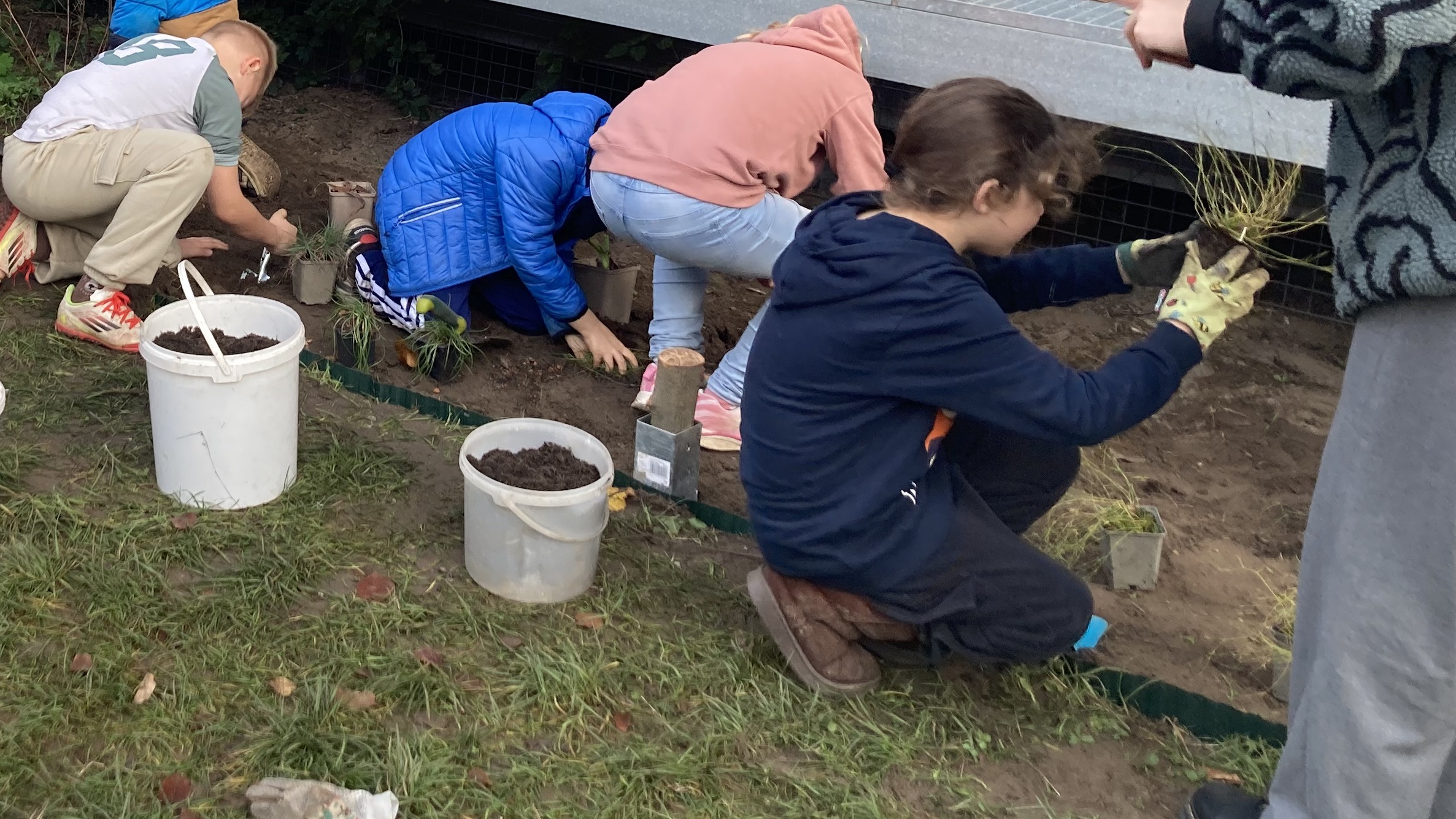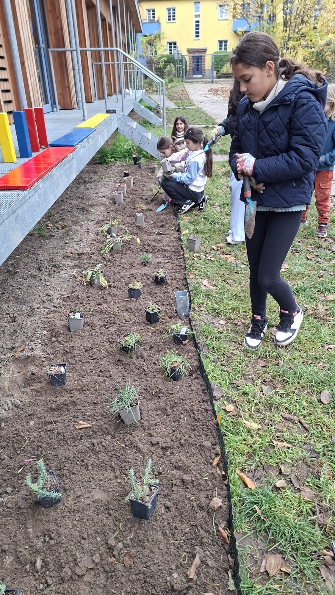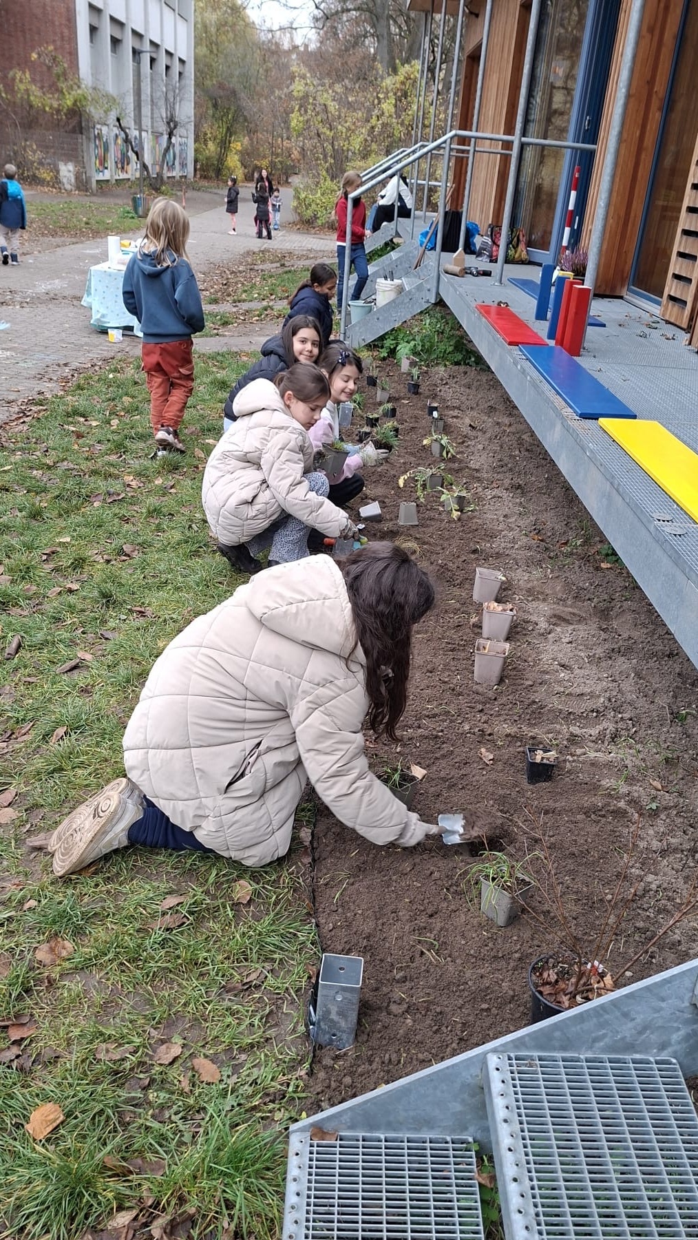 Im November haben die Klassen 3a und 2d am Fliegenden Klassenzimmer je ein Blumenbeet angelegt. Die Schülerinnen und Schüler haben unter Mithilfe von Eltern, Klassenlehrkräften und Erzieher:innen fleißig Blumen gepflanzt, Blumenzwiebeln gesetzt und einen vorher selbst